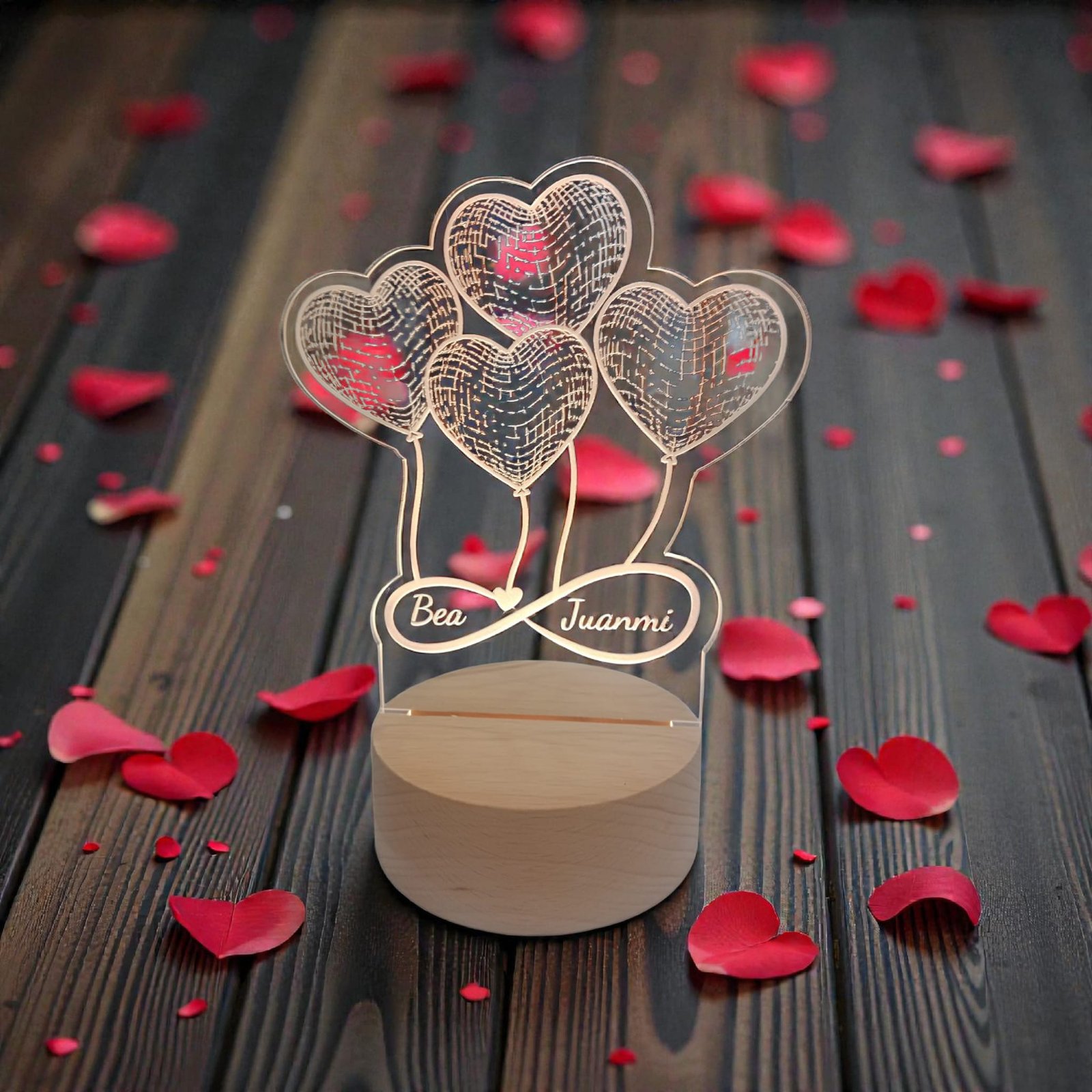 Esta lámpara de acrílico personalizada está diseñada para quienes valoran los detalles sencillos y con significado. Su composición de corazones grabados representa la unión, mientras que la personalización con nombres convierte cada pieza en algo íntimo y único.